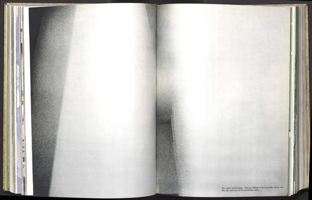 Le résultat est que les photographies apparaissent comme un bloc de 20 pages, seulement accompagnées de discrètes légendes superposées. Combinée au traitement granuleux des images et aux choix inhabituels de perspectives,cette stratégie éditoriale crée un sentiment d’immersion et de vertige, comparable à certaines des pages les plus radicales de Glass et Provoke. L’une d’entre elles montre une photographie particulièrement impénétrable du grand hall central de The Uncompleted House. La légende mentionne : « Espace vertical d’un blanc pur. Escalier menant au salon du deuxième étage.Les quatre ouvertures sont des prises d’air conditionné ». Si le blanc pur est bien présent,l’escalier et les bouches d’aération sont impossibles à discerner. La tension irrésolue entre image et mots est délibérée, peut-être même l’objet réel du photographe et de l’architecte.
