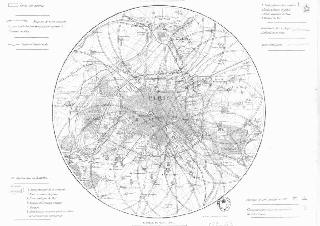 FANNY VALLIN Ce numéro aborde la façon dont certains lieux et certaines formes d’habitat ont été suspectés d’inhabitabilité. Dans ton livre La Zone. Une histoire alternative de Paris, tu retraces comment la Zone a été comme façonnée, en tant qu’espace et en tant que mythe, par la ville parisienne. Paris semble s’être construite selon un processus qu’on pourrait qualifier d’immunitaire. Dans le 1er chapitre, « Ceinture noire : la construction des marges », un document est très intéressant. Il s’agit du plan des fortifications de Paris, daté de 1843, qui montre le mur de Thiers et les lignes de feux des forts construits en retrait de ce mur. Tu dis de cette carte qu’elle montre davantage un mur qui contient, qui empêche une révolte, qu’un mur qui protège des potentielles agressions.