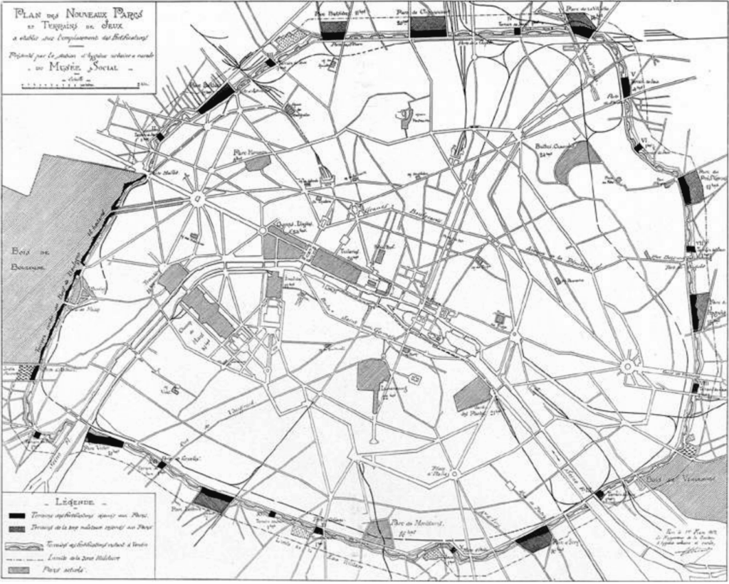J. T. Ce qui est assez intéressant, c’est que toutes les parties prenantes sont d’accord pour dire que cette Zone est vouée à être détruite. C’est-à-dire que cette Zone, faite de cahutes et d’habitats plus ou moins solides, plus ou moins décents, ne peut rester en l’état, que l’on soit un·e urbaniste hygiéniste, progressiste ou réactionnaire. Assez vite, à partir de 1870, les fortifications n’étant pas utiles d’un point de vue stratégique et militaire, elles doivent elles aussi être détruites. Se déroule donc un grand débat sur l’avenir de cet immense espace, qui représente à l’époque 15 % de la superficie de Paris. C’est bien sûr une réserve foncière incroyable et une opportunité qui, tout le monde en est conscient, ne se représentera jamais, en tout cas pas pendant des siècles. C’est donc « l’opportunité du siècle ». Une partie de ce débat finit par se mettre d’accord sur le fait de transformer la Zone en un grand espace vert, un grand parc annulaire qui entourerait Paris. Il faut donc, évidemment, expulser les habitant·es de la Zone, ce que fera Vichy dans les années 1940, manu militari. Le maréchal Pétain appelait la Zone « la ceinture lépreuse ». Celle-ci est donc quasiment entièrement vidée de ses habitant·es et de ses habitations. Presque tout est rasé, à part un petit bout vers Levallois-Perret, et à la place, commence à se construire ce projet de grand parc annulaire. Les nombreuses pénuries provoquées par la guerre ralentissent les travaux, mais un ensemble de stades, de cours de tennis et d’aires de jeux qui, pour la plupart, sont encore là aujourd’hui, voient le jour. Ce qui s’explique d’une part car le centre de Paris manque de réserve foncière pour construire des stades, et d’autre part car l’un des aspects de la pensée hygiéniste, qui est encore en cours aujourd’hui, est de faire de l’éducation physique : la jeunesse doit se dépenser, la jeunesse doit se muscler, un esprit sain dans un corps sain. L’idée de faire un immense parc annulaire, elle, ne verra pas vraiment le jour, même si on commence un peu à le tracer.